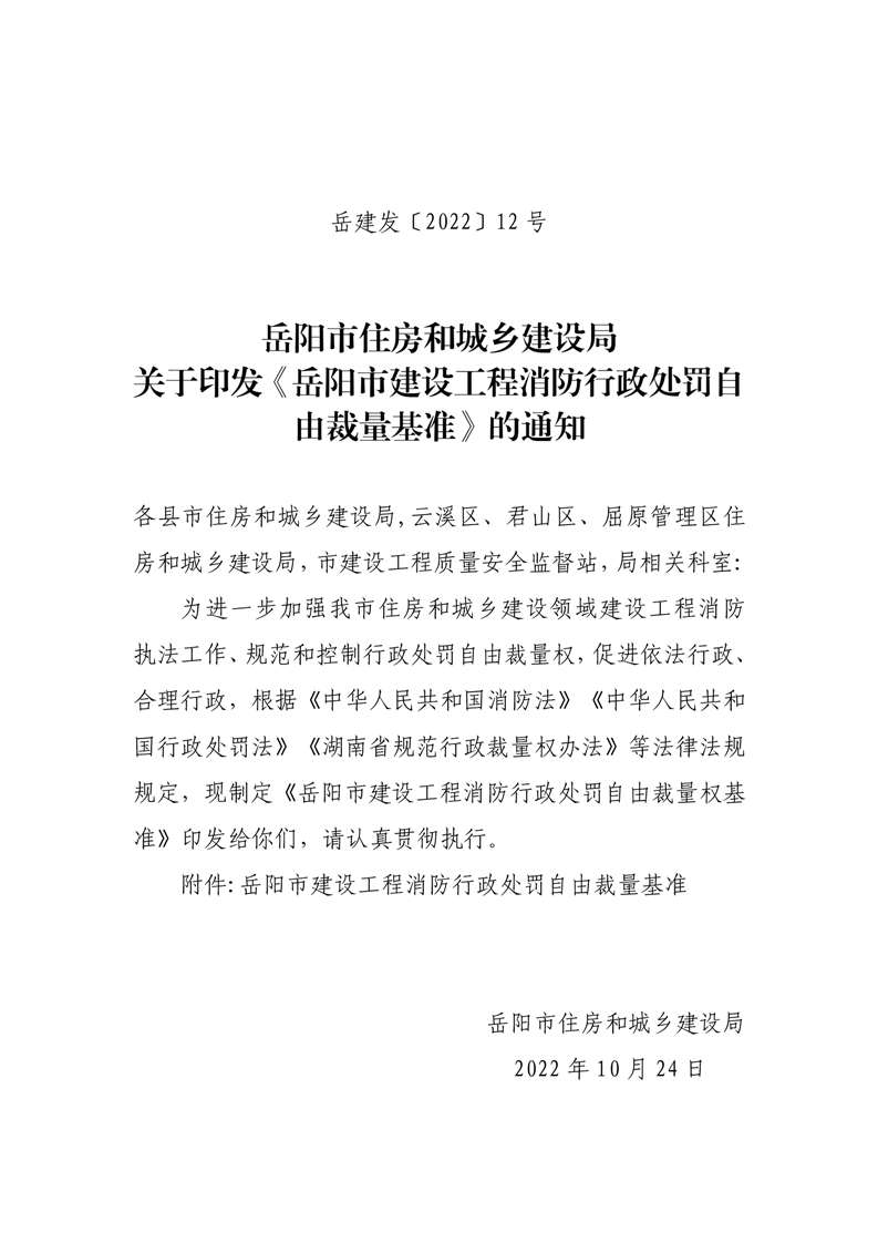 关于印发《岳阳市建设工程消防行政处罚自由裁量基准》的通知(岳建发[2022]12号)