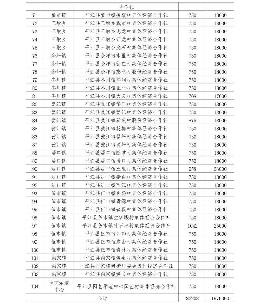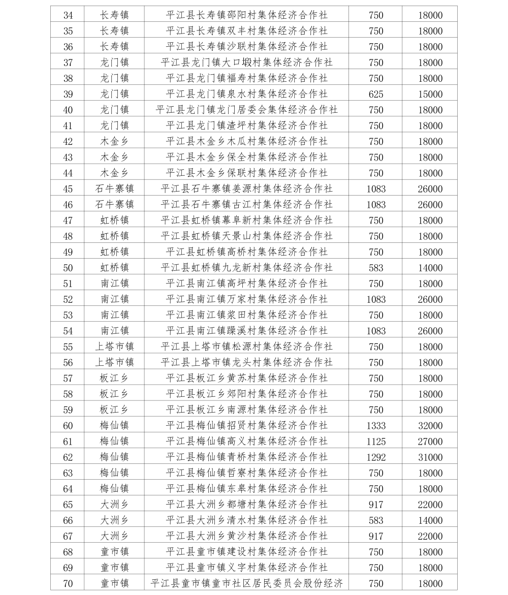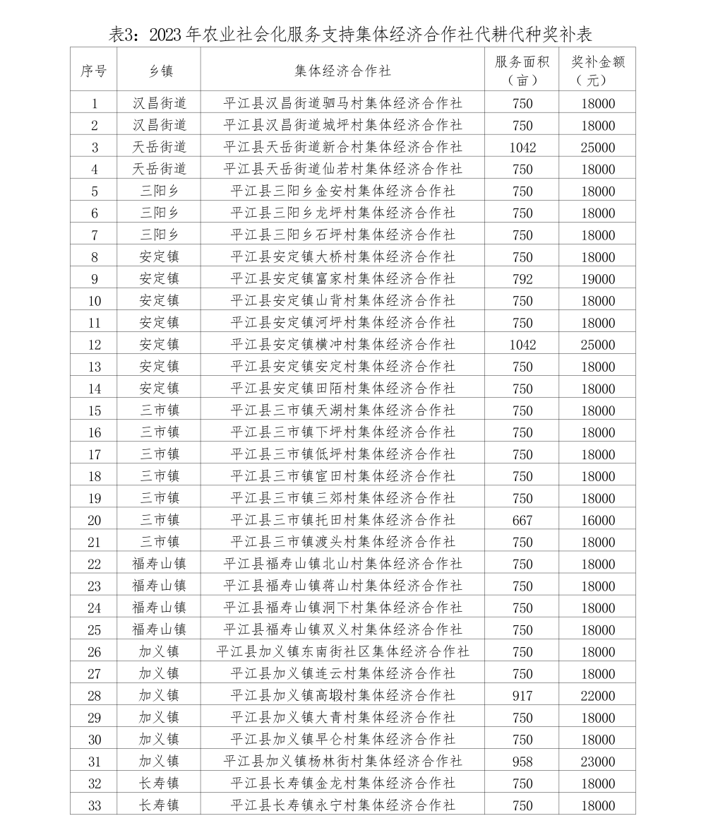 3、支持村级集体经济组织代耕代种服务197万元,服务面积共8.8万亩,补助标准24元/亩(见表3)。