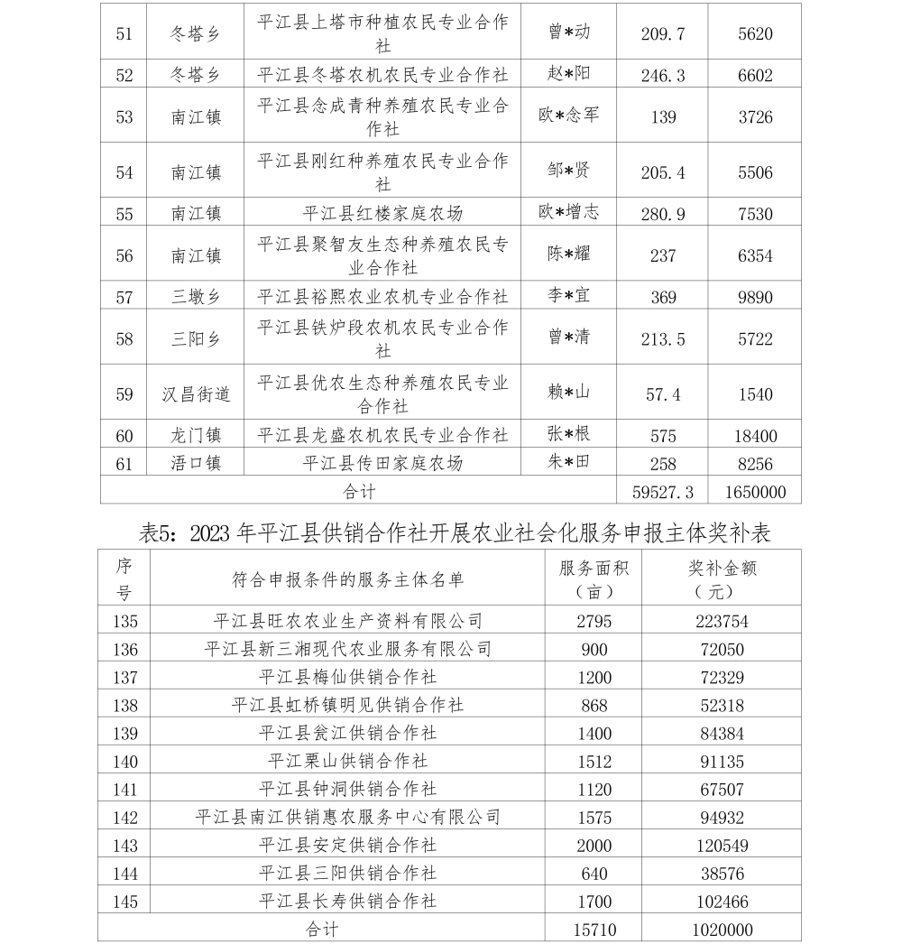 为了切实做好我县农业社会化服务工作,用好用活和充分发挥中央农业社会化服务资金的作用,平江县人民政府办公室2023年6月9日下发了《关于印发<平江县2023年农业社会化服务工作实施方案>的通知》(平府办便函〔2023〕26号)文件,文件明确了工作职责,集中绿色生产技术服务,烘干、仓储、品牌建设服务,村级集体经济组织代耕代种服务,以上三项工作由农业农村局负责实施;机插机抛服务由畜牧农机水产事务中心负责实施;供销合作社服务试点由县供销合作社负责实施。2023年9月5日,湖南省财政厅《湖南省财政厅关于下达2023年中央农业社会化服务资金的通知》(湘财预〔2023〕195号)文件,下达中央农业经营主体能力提升资金644万元。根据湖南省农业农村厅办公室《关于认定2023年省级示范区域性农业社会化综合服务中心的通知》(湘农办发〔2023〕85号),认定平江县利农种植农民专业合作社为省级示范区域性农业社会化综合服务中心,支持资金100万元。目前我县2023年度农业社会化服务工作已经完成,根据省农业农村厅文件精神、省财政厅项目绩效目标要求和我县农业社会化服务工作实施方案,544万元资金分配如下: