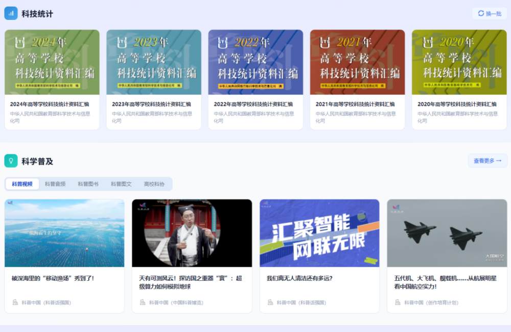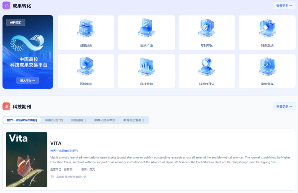 聚焦服务教育科技人才一体化发展,设置“平台共享”“成果转化”等专栏,打造一体化科创资源平台,强化科研资源共享、成果转化、科创人才培养,助力提升高校科技创新效能。