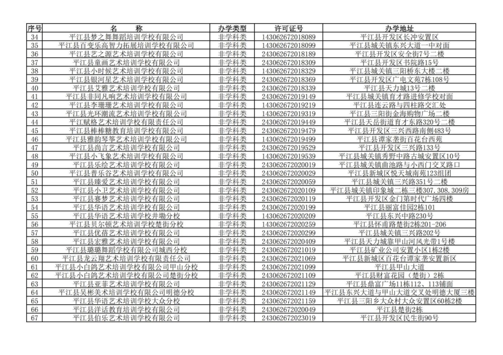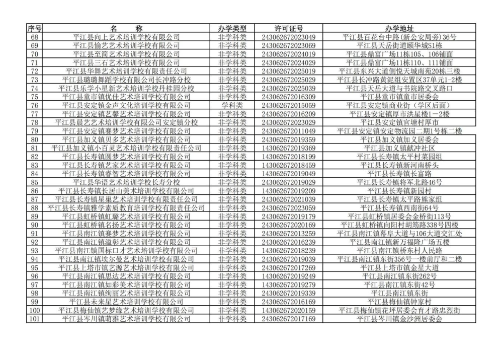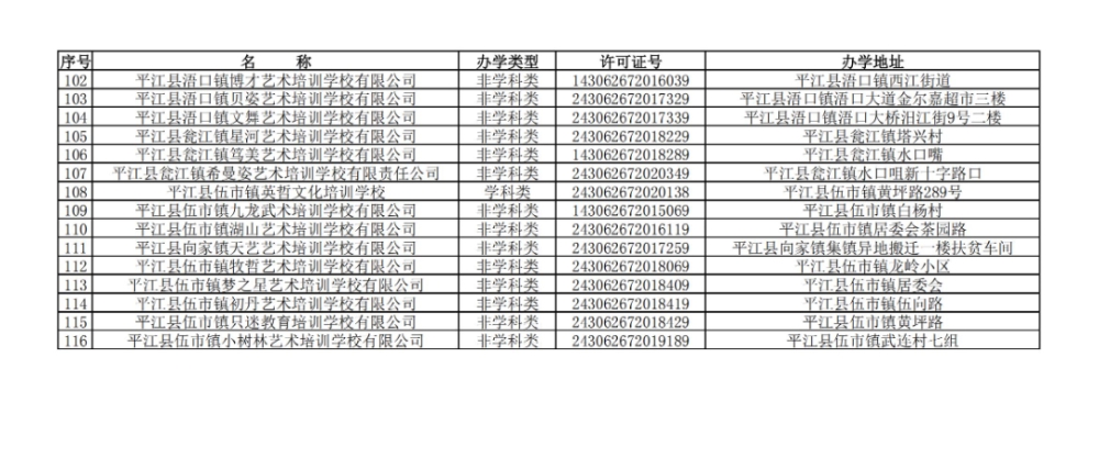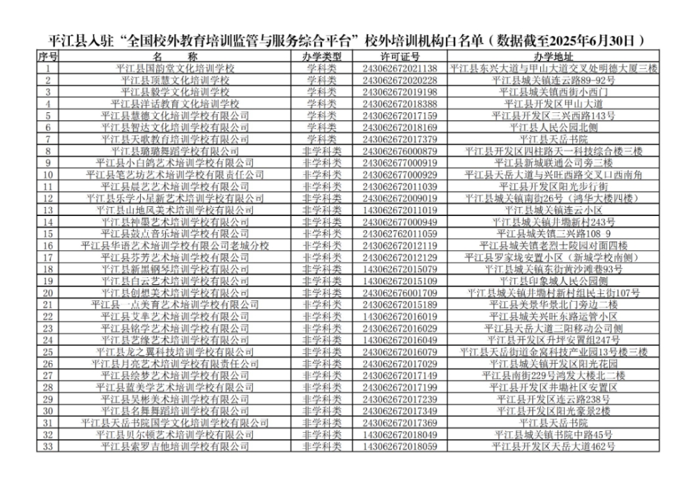 平江县入驻“全国校外教育培训监管与服务综合平台”校外培训机构白名单(数据截至2025年6月30日)
