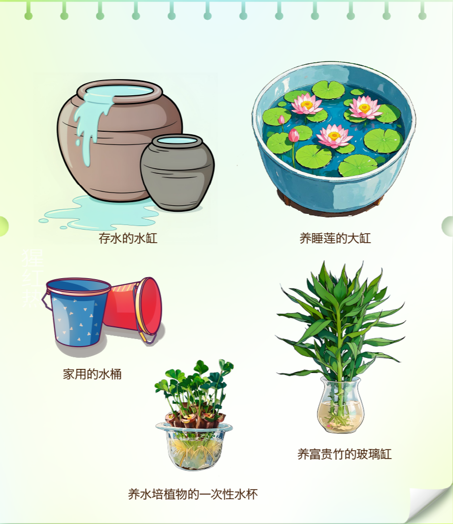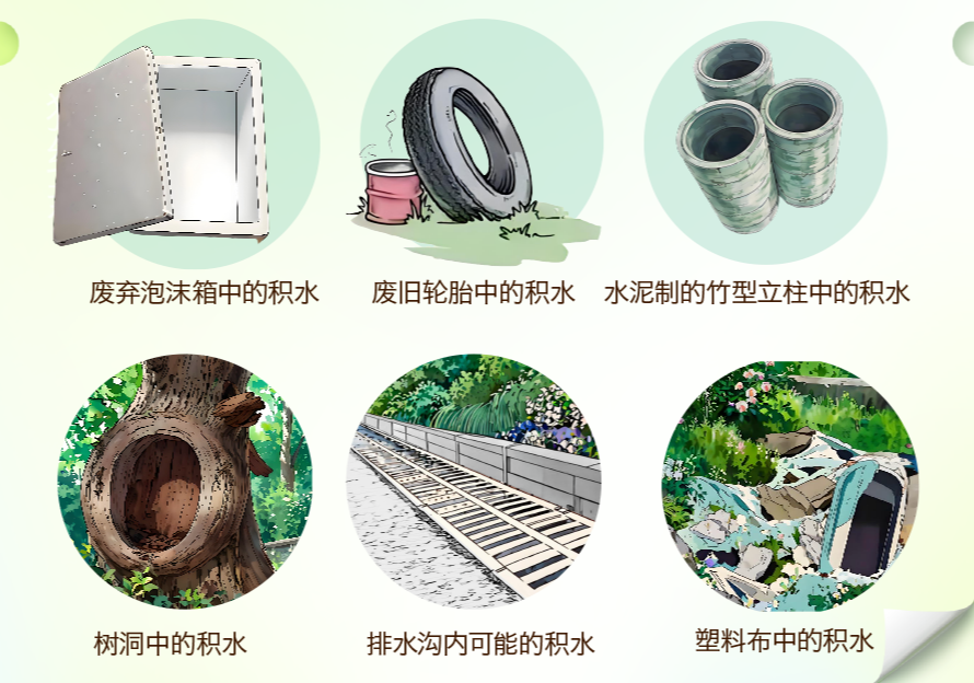 3. 花瓶、盆景等水生植物每3~5天换水一次,并冲洗根部。不在露天堆放废弃轮胎,或用塑料布覆盖,不留积水。