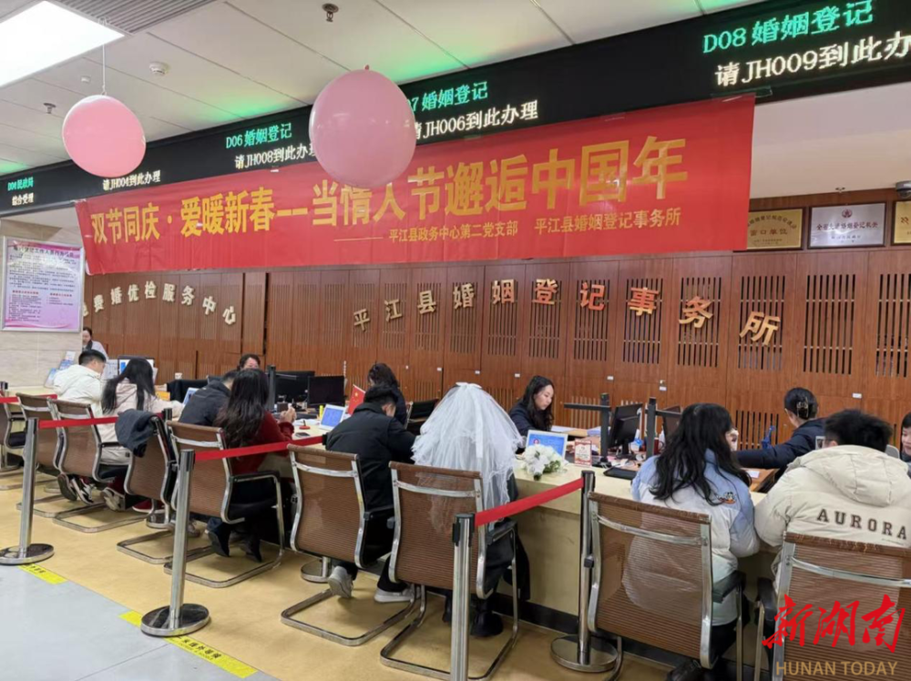 2月14日是2026年春节假期前的最后一个工作日,当西方情人节与中国传统春节浪漫相遇,平江县婚姻登记窗口迎来了一波结婚登记小高峰。为满足新人们想在这一特殊日子喜结连理的美好愿望,平江县民政局提前谋划,联合县数据局、县妇幼保健院精心组织开展“当情人节邂逅中国年”主题活动,为新人们送上了一份仪式感满满、实用性十足的新春“甜蜜大礼包”。