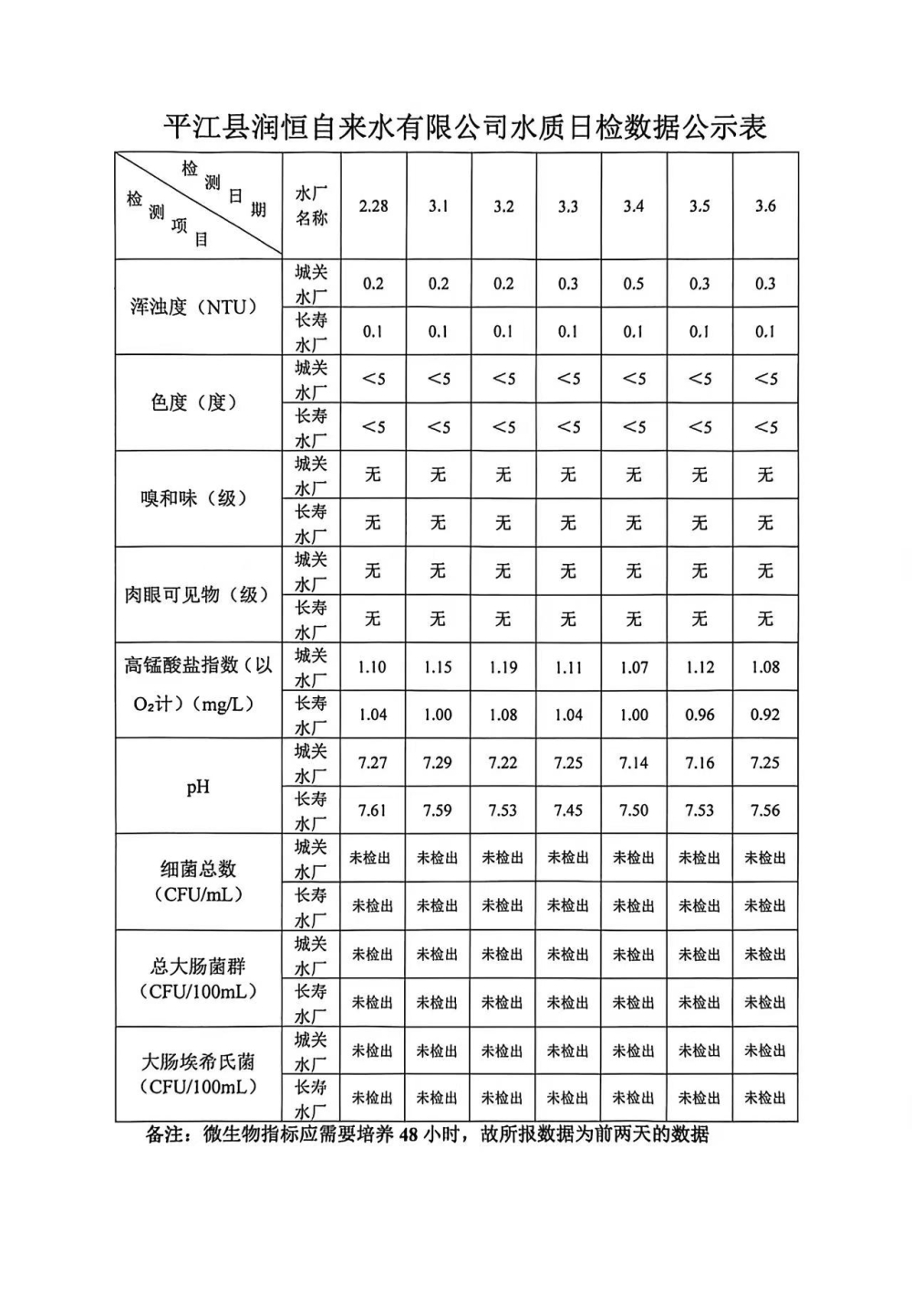 平江县润恒自来水有限公司水质日检数据公示表3.6