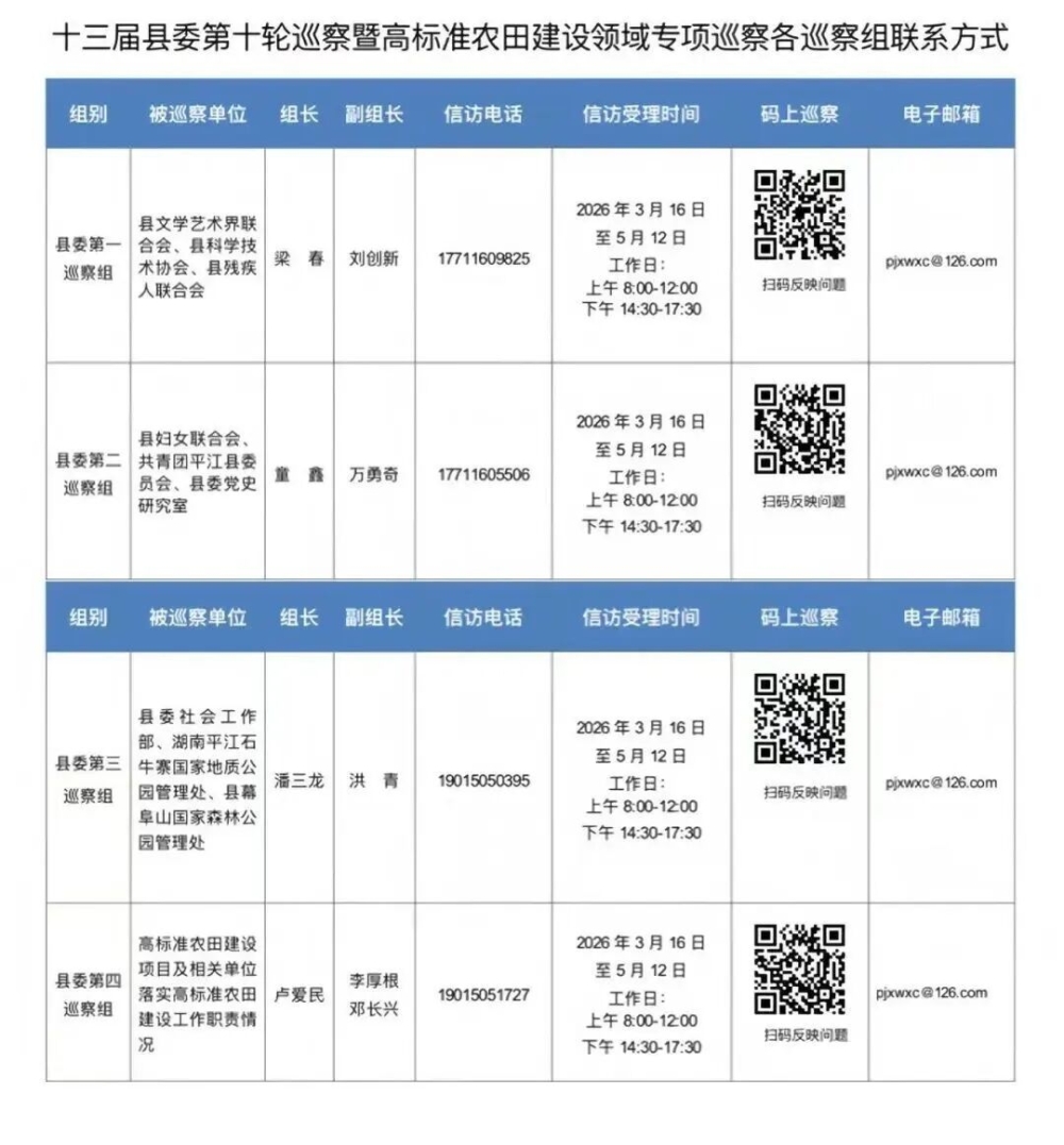 据悉,本轮巡察时长为40个工作日,巡察期间,各巡察组分别设立专门值班电话、信访邮箱和“码上巡察”二维码,主要受理反映被巡察党组织领导班子及其成员、下一级党组织领导班子主要负责人和重要岗位机关干部职工问题的来信、来电、来访,重点是关于违反政治纪律、组织纪律、廉洁纪律、群众纪律、工作纪律、生活纪律和中央八项规定及其实施细则精神等方面的举报反映。不属于巡察受理范围的信访问题,将按规定转交相关部门单位受理。县委各巡察组受理信访截止时间为2026年5月12日。