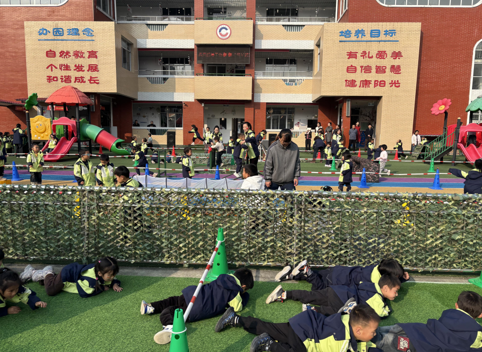 随着集结号响起,身着迷彩元素的孩子们迅速列队,投入军事体能训练。匍匐、跨越、奔跑……他们眼神坚毅、动作有力、口号响亮,展现出小小“士兵”的纪律性与精气神。紧接着,《歌唱祖国》旋律奏响,全体幼儿挺直腰背,以清澈而饱含情感的童声齐唱,爱国之情自然流淌。这连贯而振奋的一幕,将活动推向高潮,也成为红色文化日常浸润的鲜活写照,引得观摩嘉宾纷纷拍照记录。