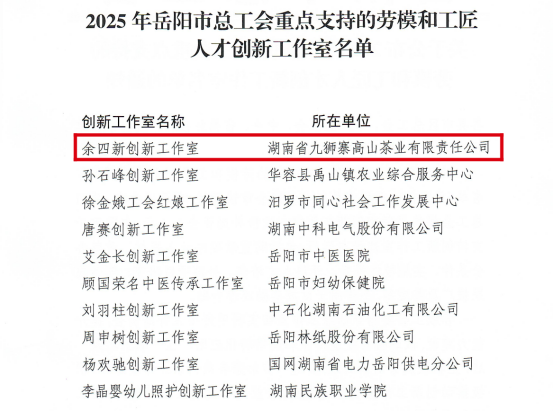 近日,2025年岳阳市总工会重点支持的劳模和工匠人才创新工作室名单公布,我县湖南省九狮寨高山茶业有限责任公司“余四新创新工作室”成功入选。