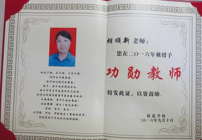 加减乘除,算不尽她的奉献!油盐酱醋,调出了桂花佳肴!坚持、坚守、坚决……对师德、师技、师能做出了最好的表率。她就是我们学校的一姐胡顺新。”