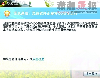 昨晚,部分QQ用户遭遇到腾讯弹出的《紧急通知:恶意软件正破坏QQ安全运行》,“请您马上卸载360软件之后再重新启动QQ”,只提供“退出程序”一个按钮。稍后,腾讯QQ空间和“QQ餐厅”等网页游戏发布公告,称使用“360安全浏览器”的用户将无法登录。