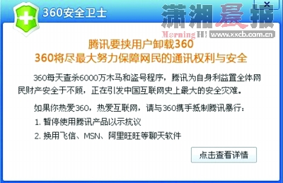 360方面表示,公司已向监管部门汇报,国家将对腾讯危害网民安全的行为进行紧急干预。