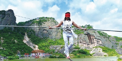 石牛寨国家地质公园蒙眼倒走钢丝活动