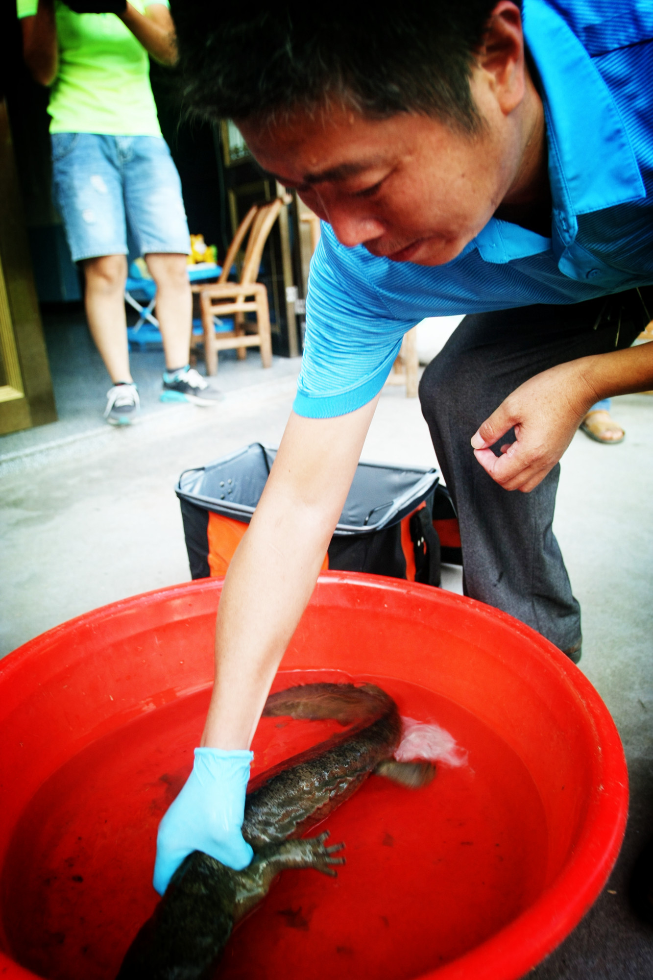 森保站和野生动物救助站人员对娃娃鱼进行检测