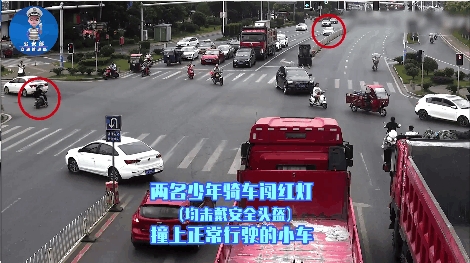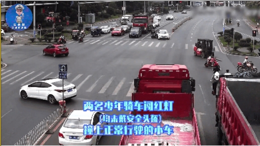一名少年驾驶电动自行车载着同学(两人均未佩戴安全头盔),来到一处红绿灯路口东北角后,闯红灯来到路口东南角,在由东向西依然是红灯的情况下闯灯而行,结果一头撞上一辆正常左转的轿车右侧。