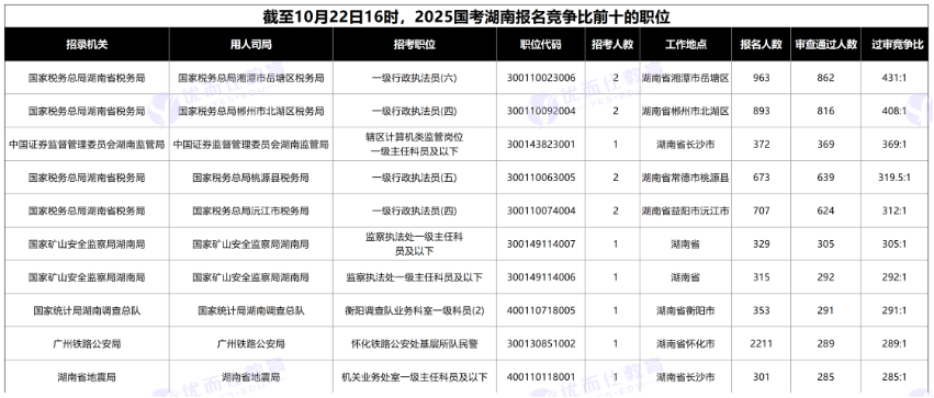 截至10月22日16时,2025国考报名人数最多前十职位。图片来源:优而仕教育