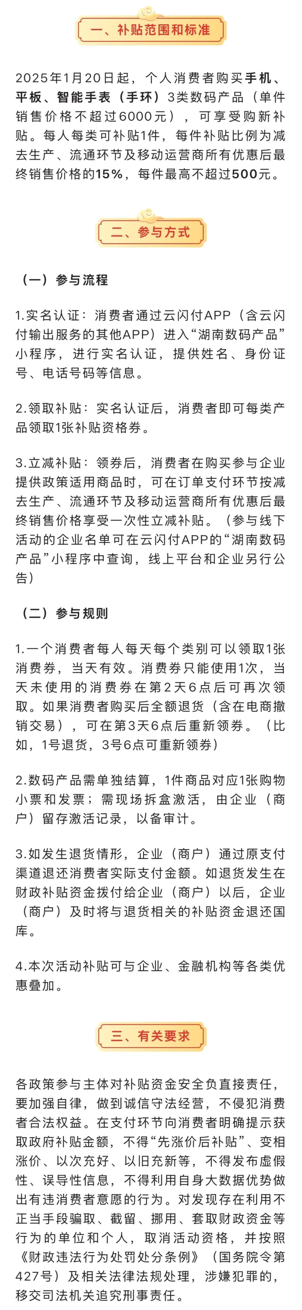 今天,湖南省商务厅发布《关于扩围实施湖南省数码产品购新补贴政策的公告》,老百姓一直期待的湖南省2025年数码产品购新补贴政策来了!一起来看↓