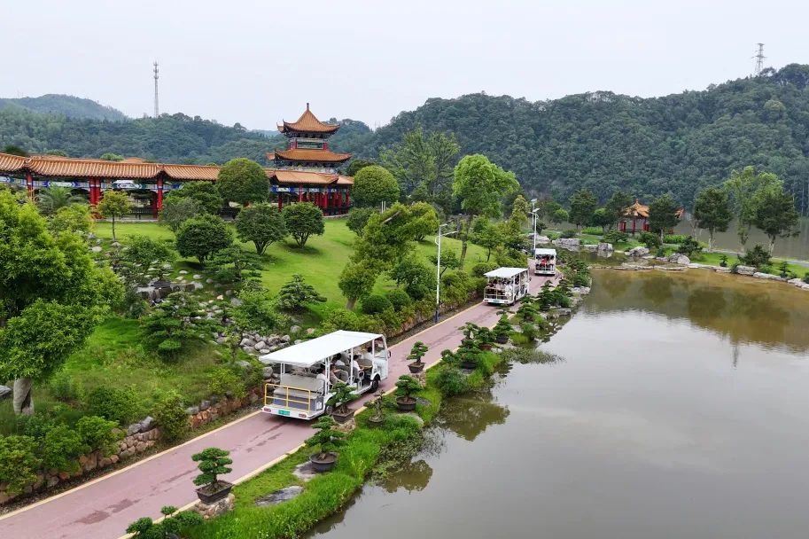 在华雅盘石洲森林花园,观摩团嘉宾们沉浸式与大自然亲密接触。景区三面环江,犹如一张“绿色飞碟”飘浮于江水之上,湖光山色美不胜收。四周高山林木苍翠,古树参天,仿佛是大自然精心绘制的一幅画卷。景区用特色园艺打造的五福岛、青云桥、溪涧栈道等景观和山庄,层楼叠榭,一步一景。