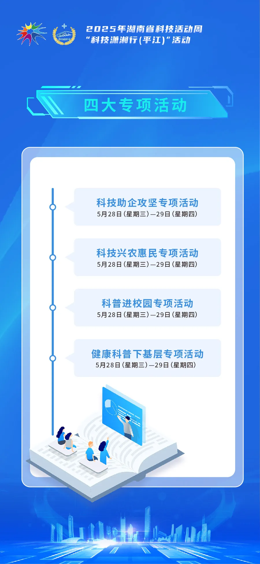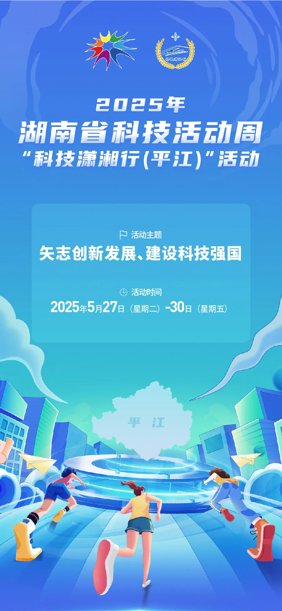 2025年5月24—31日是第二十五个全国科技活动周,5月30日是第九个全国科技工作者日。2025年湖南省科技活动周“科技潇湘行(平江)”活动即将开启,有哪些不能错过的亮点?快跟着我们一探究竟!