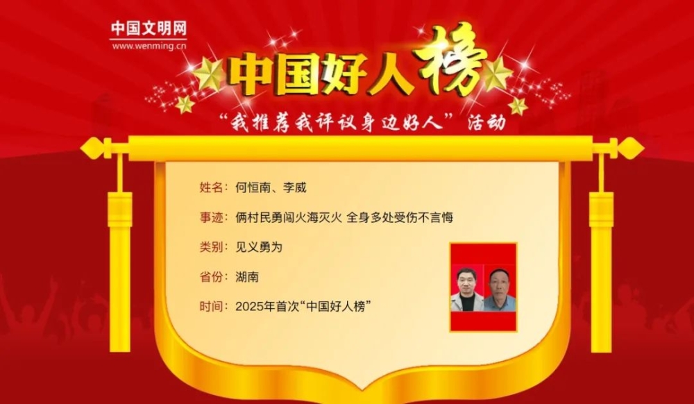 6月24日,中央精神文明建设办公室发布2025年首次“中国好人榜”,平江有两人光荣上榜,他们是——何恒南、李威。让我们恭喜他们!向榜样学习!