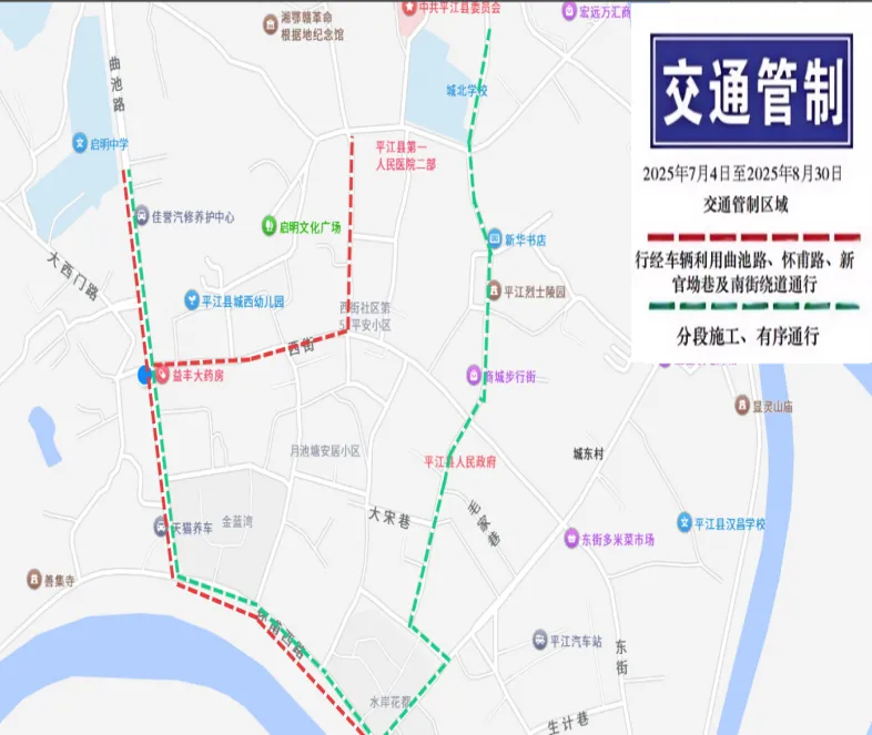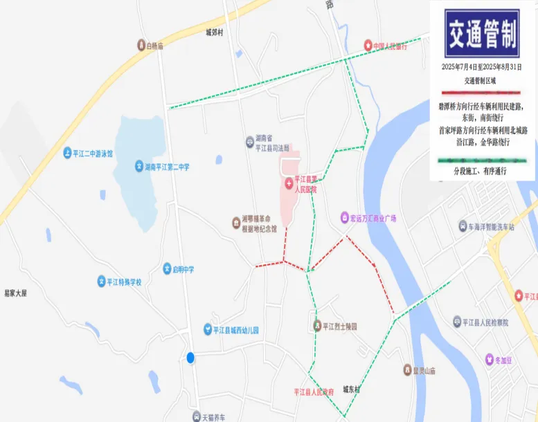 怀甫路:小码头至平江大桥半幅:(半幅分段封闭施工),时间:7月4日至8月30日