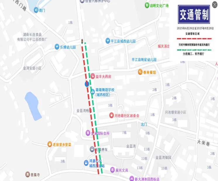 花溪巷:启明路花溪巷口至西街花溪巷口施工段:(全幅分段封闭施工),时间:7月4日至8月15日
