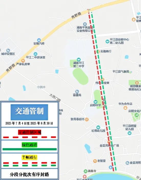 大桥西路:民建路路口至平江大桥半幅:(半幅分段封闭施工),时间:7月4日至8月30日