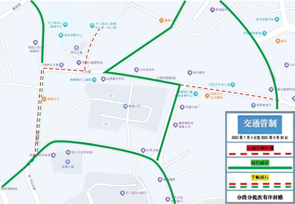 三兴路:大桥东路路口至横巷街幼教中心门口(全幅分段封闭施工),时间:8月1日至8月15日