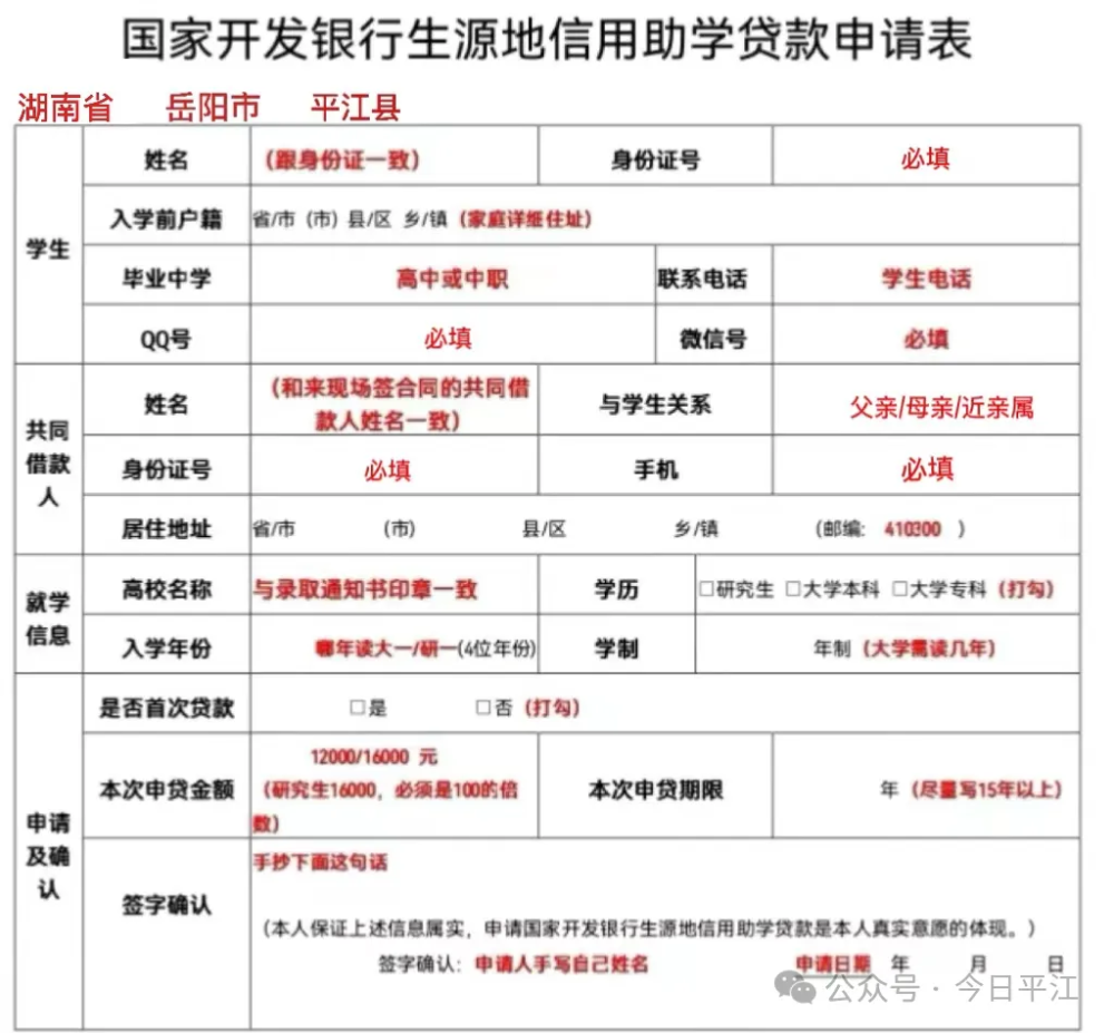 办理地点:平江县教育局前栋1楼生源地助学贷款办理中心(三阳乡平源村)。
