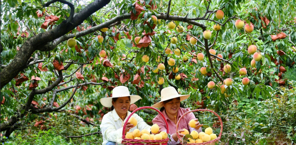 盛夏的幕阜黄龙山巅,山风推动着巨大风机缓缓旋转,云雾缭绕间,湖南省岳阳市平江县南江桥镇百合村锦绣黄桃基地迎来了一年中最甜蜜的时节。