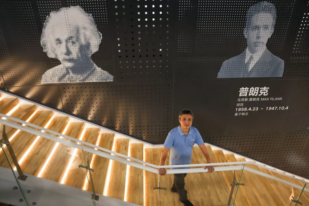 彭承志在科大国盾量子技术有限公司楼梯前留影。图源:新华社