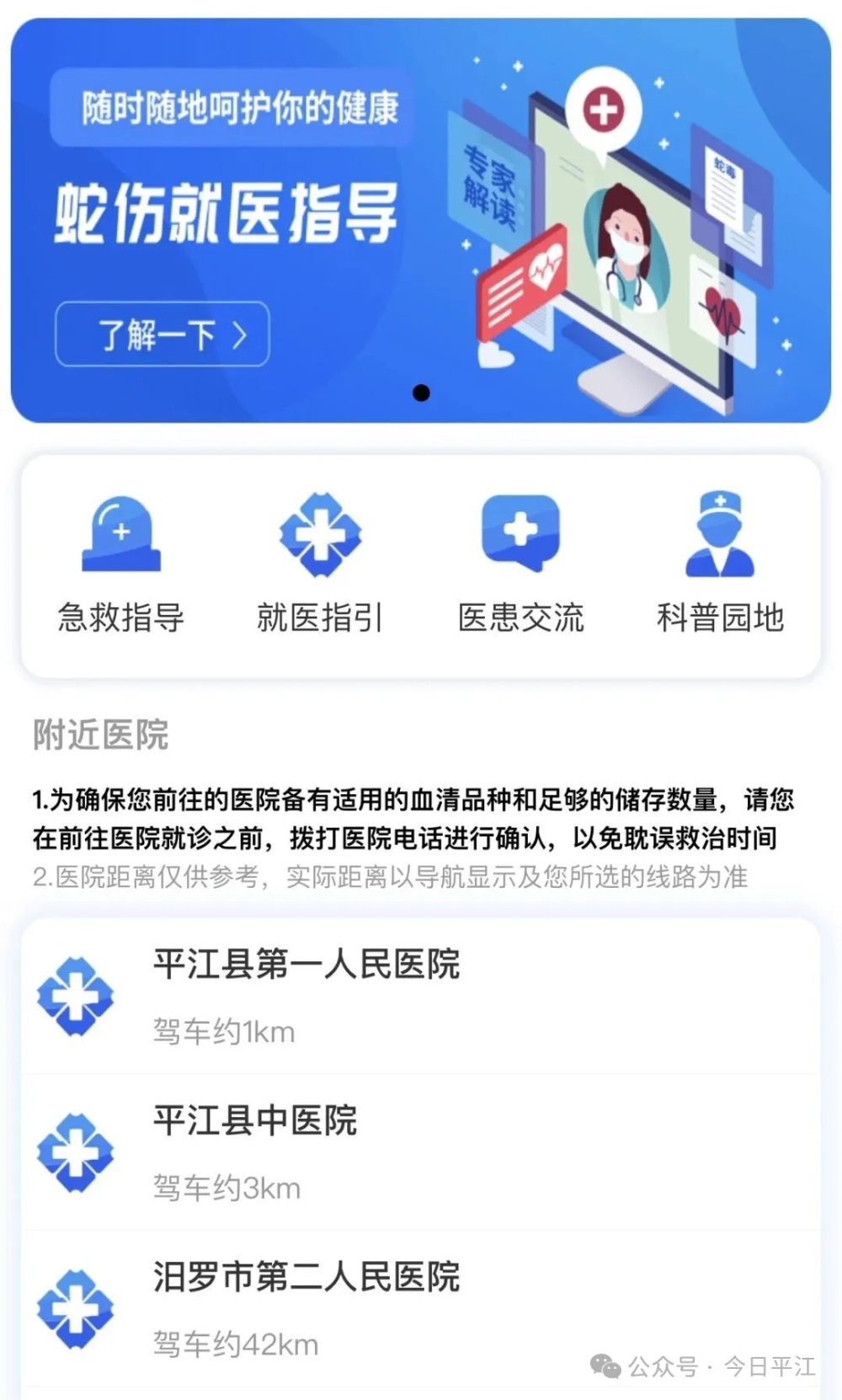 近期,平江天气启动高温多雨模式,高温高湿环境下,蛇类活动也随之进入高峰期。被毒蛇咬伤后该怎么办?平江哪些医院储备有抗蛇毒血清?
