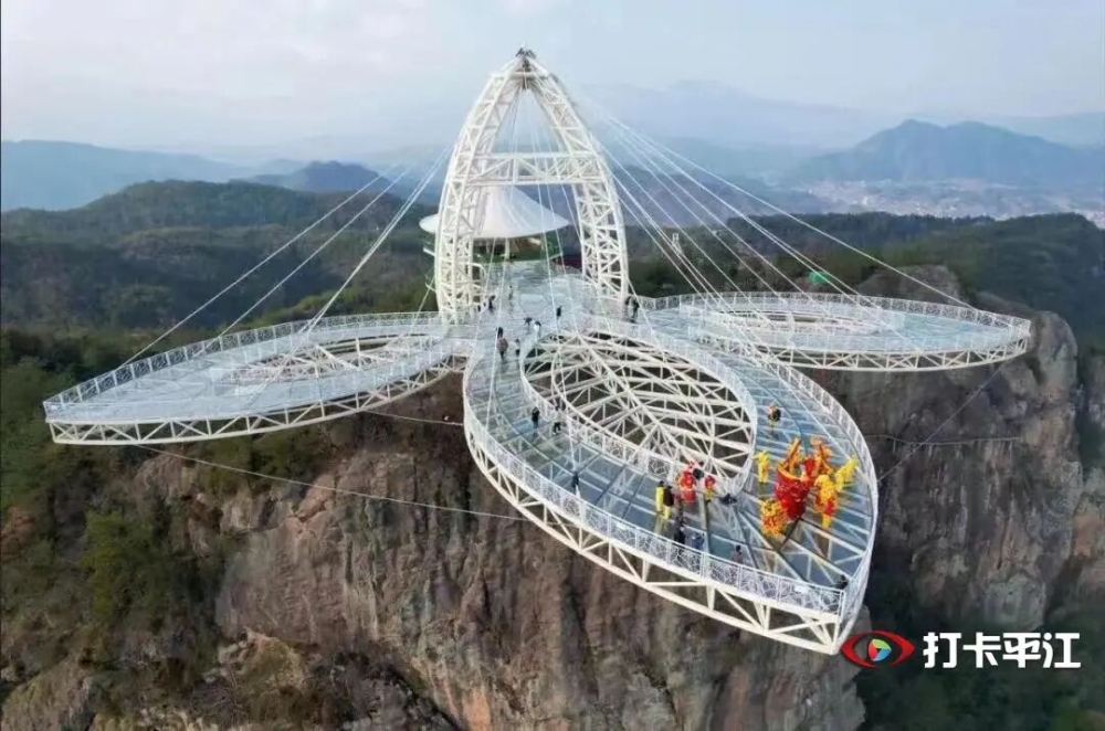 步入景区,一眼就能看到标志性打卡建筑“悬崖天眼”,这是世界最大三叶草玻璃高空观景平台,以360°悬空设计,让你伸手似触碰云端,低头可见层叠丹霞。