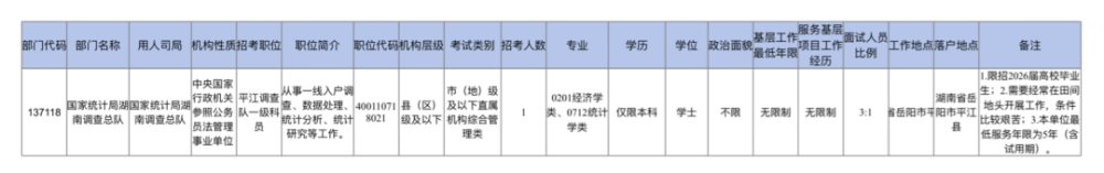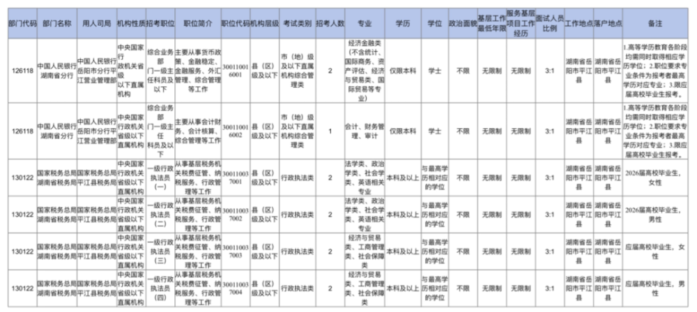 10月15日至24日,中央机关及其直属机构2026年度考试录用公务员报名通道开启,共计划招录3.81万人。其中,招录工作地点在平江的有7个职位,共计12人。