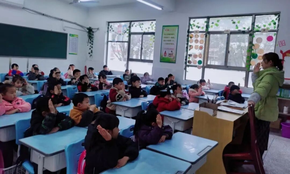 浯口中心小学的教室装扮一新,老师们细致严谨地检查寒假作业,旁边的学生也在帮着忙,眼神里满是对新学期的期待。