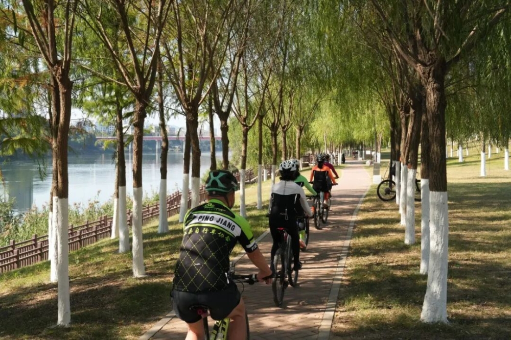 从山林回到城区,平江县城还藏着另一道春日风景线——汨罗江城区沿线的骑行绿道。这里没有山路的崎岖,只有平坦宽阔的骑行道,和两岸连绵的春光。