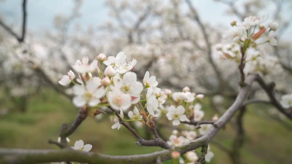 如果说桃花是春日的热烈,那梨花就是春日的清雅。在伍市镇园艺示范中心,上千亩梨树花开,雪白一片。远远望去,仿佛一夜之间落满了雪,又像是云朵落在了枝头。走近细看,洁白的花瓣簇拥着淡黄的花蕊,素雅清丽,让人不忍惊扰。
