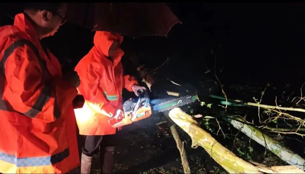 当天夜里,党员干部们举着手电筒,形成一道道移动的光束。雨水打湿了衣衫,泥浆沾满了裤腿,他们却顾不上擦拭,奋力锯断倒伏的树干,合力将沉重的树干抬到路边,再用铁锹铲除路面的淤泥和杂物。