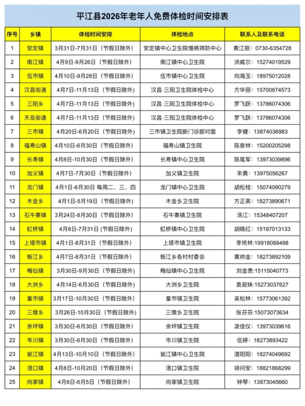 好消息!平江县2026年65岁以上老人免费体检开始啦!这是国家基本公共卫生服务项目,每年一次,全程免费,为老人健康“保驾护航”。今年各乡镇体检时间、地点怎么安排?这份“家门口”的体检时间表,请收好——