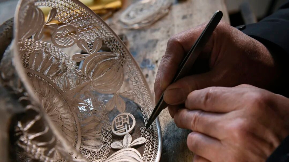 除了大型的民俗表演,平江还有精细入微的指尖技艺—花丝镶嵌制作技艺。