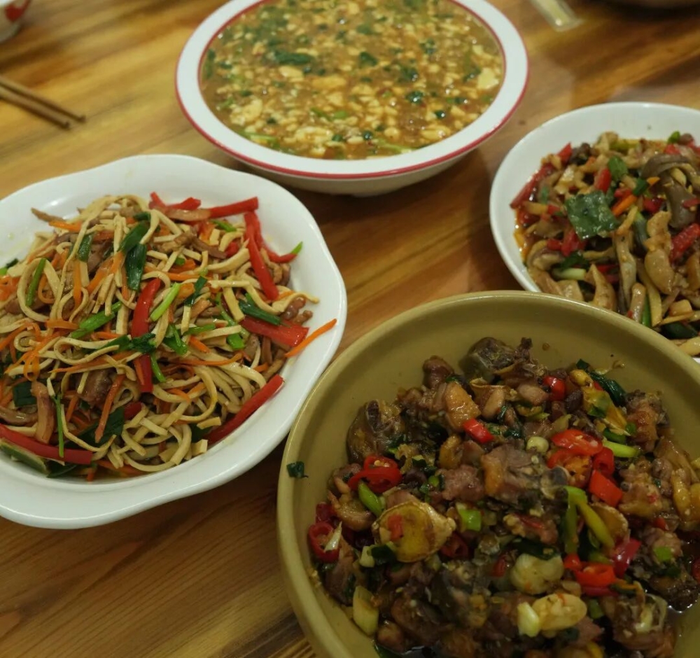 酸辣猪肠脆嫩爽口,小鱼焖豆腐汤汁醇厚,红烧肉焖土豆软糯入味,每道菜都超级下饭。