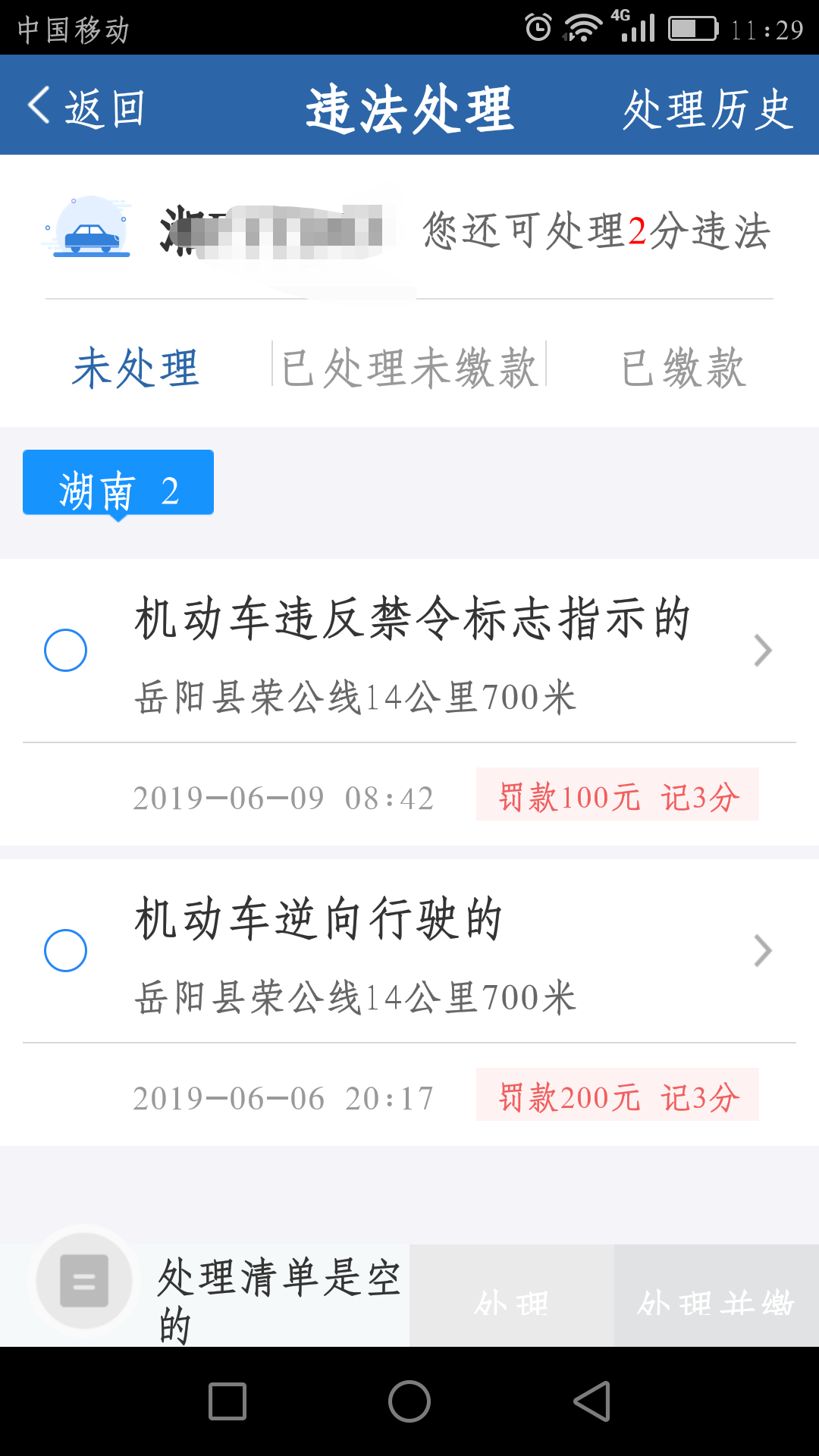 再次反馈: 没看清附件吗?两份罚单都是六月份,相差3天,据我朋友所说,他们的罚单也是和我同一天从那里经过,按违反禁令标志行驶处罚的,罚100扣3分(需要我截图给你们看吗),别扯到5月份两天上面去。告知方式也存在问题,现在很多人都住岳阳,为什么不在岳阳市交警支队微信公众号上面告知,现在有几个人看电视,更何况岳阳城区也收不到岳阳县电视台,造成一天不知道有多少车辆在那里违章(一块单行线标志牌也被挡住了,看不清)。
