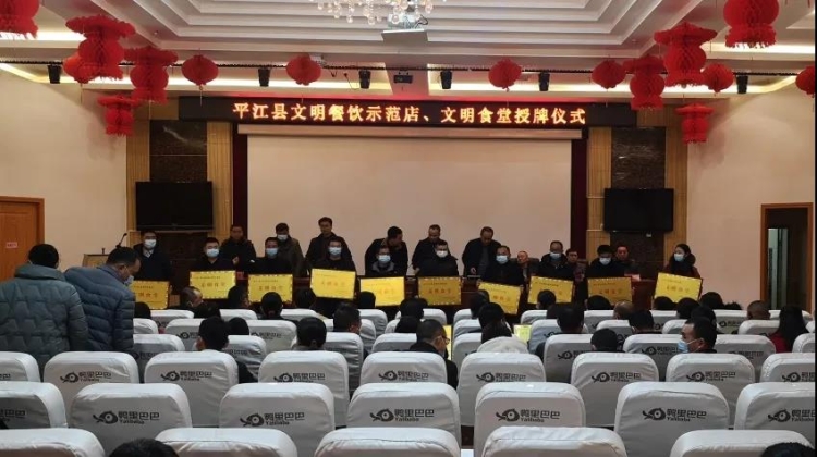 “文明用餐,使用公筷公勺,有序排队取餐,不喧哗吵闹,注重餐桌礼仪;卫生用餐,搞好厨房、餐厅餐桌清洁卫生;安全用餐,不用地沟油,禁售野生动物,提供放心食材……”1月21日,2020年平江县文明餐饮示范店、文明食堂授牌仪式举行, 20家餐饮门店、30家食堂成为首批“文明餐饮示范店”“文明食堂”。县委常委、宣传部长熊江新出席授牌仪式。