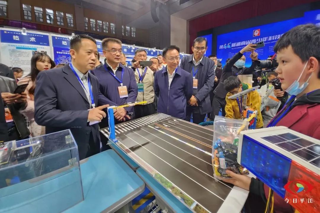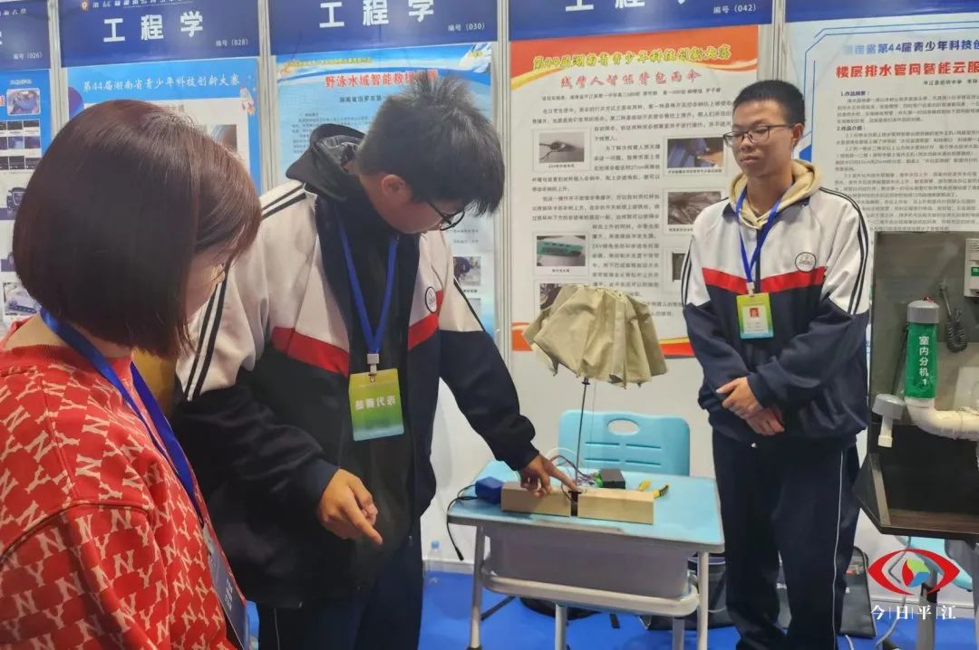 开幕式结束后,活动嘉宾参观了优秀作品展示区域,听参赛选手们讲解作品的创作背景、设计原理和主要贡献。来自平江启明中学参赛小组的作品是楼层排水管网智能云服务系统,“排水管堵塞是让很多家庭头疼的问题,我的发明可以防患于未然,在管道堵塞前预警,并在第一时间准确找到地下管网即将堵塞位置进行疏通。”来自平江第一中学的参赛小组研究的项目是残臂人智能背包雨伞,“对这个项目,我们未来还有很多想法去优化它,希望以后真正为残臂人解决撑伞方便的问题。”展示现场,太阳能水面清洁卫士、废旧电池电能回收简易装置、升降井盖排水装置、云顶智能消防系统等等创意作品吸引了大家观摩。