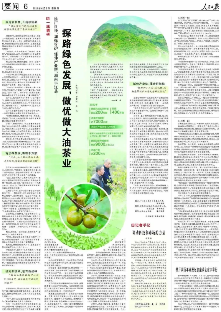 6月8日,《人民日报》纸媒在要闻版整版刊发文章《平江县探路绿色发展 做优做大油茶业》,讲述我县油茶产业转型升级的故事。以下为报道原文。