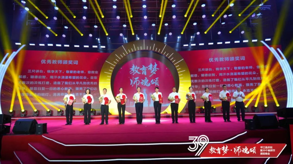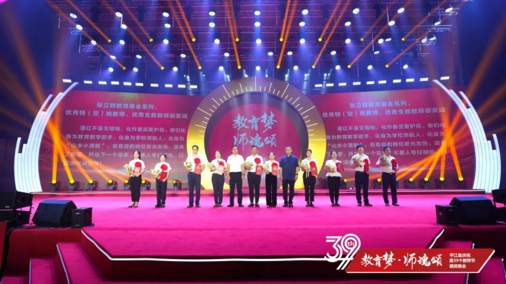 9月7日晚,我县举行庆祝第39个教师节颁奖晚会,隆重表彰教育战线先进典型,大力弘扬尊重知识、尊重教师的良好风尚。县委书记李勇出席并讲话,县委副书记、政法委书记鲁勇主持。凌晓明、熊江新等县委、县人大、县政府、县政协、县人武部在职在家领导,县法院院长、县检察院检察长出席;国家审计署来平审计组组长、永州市审计局副局长宋晖受邀出席。第39个教师节所有县级受表彰对象等参加。
