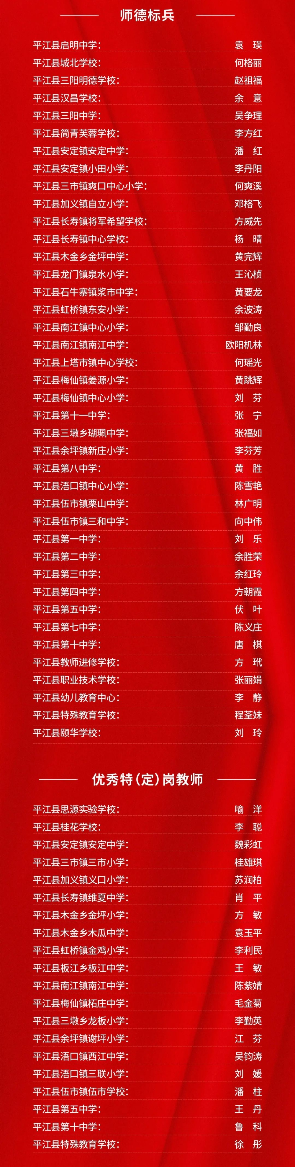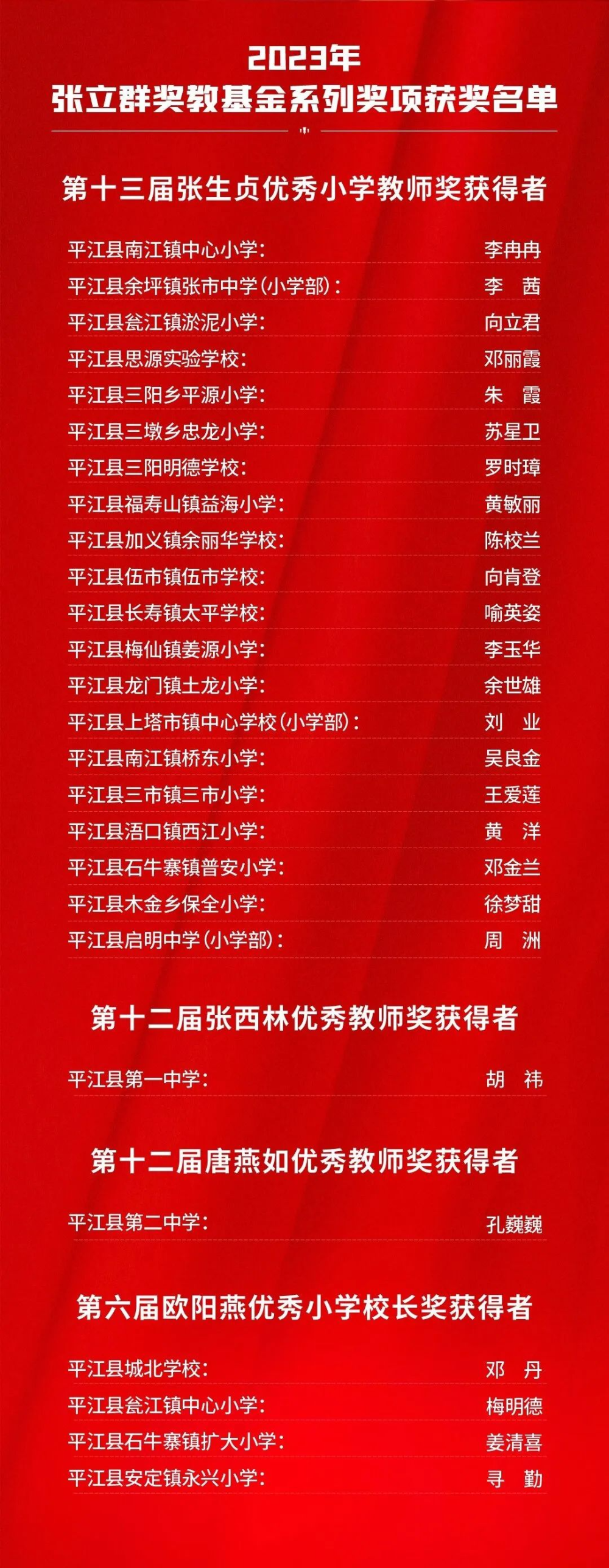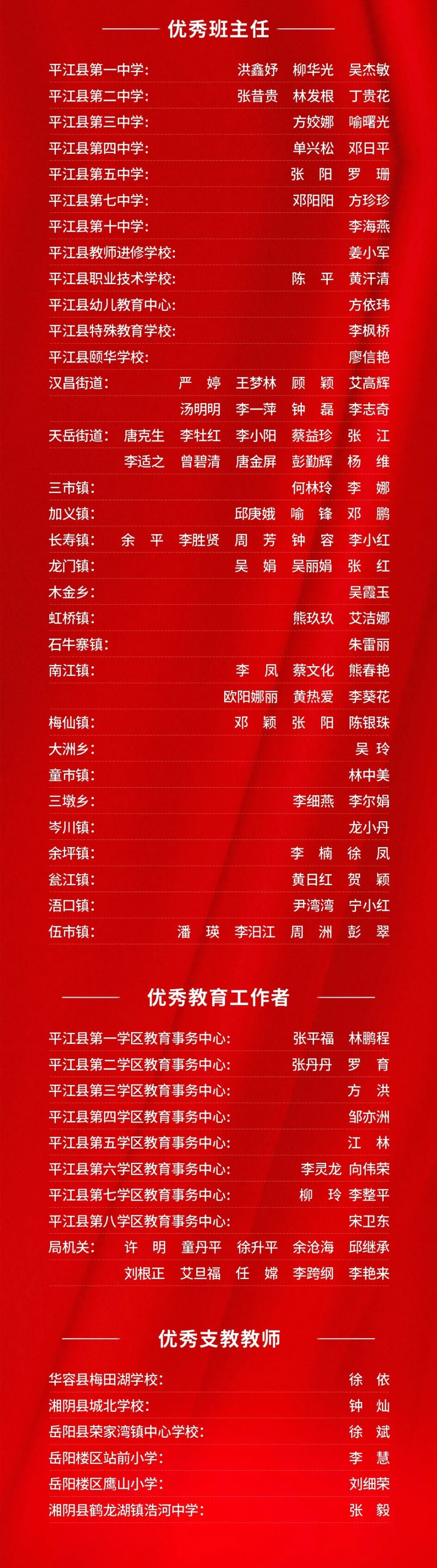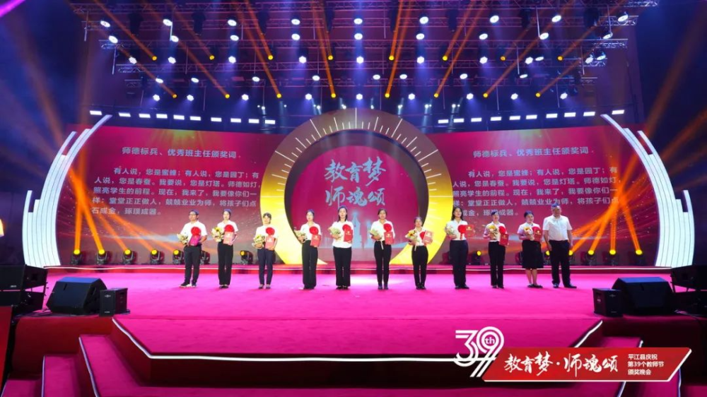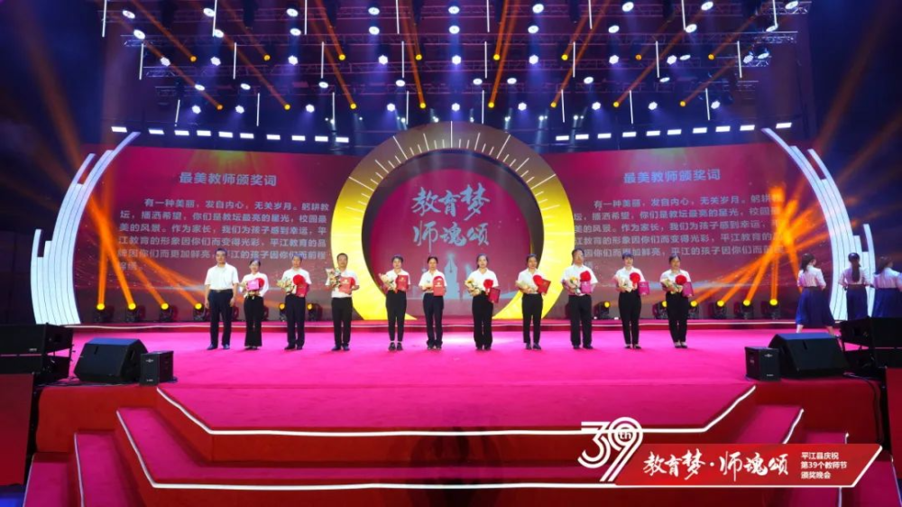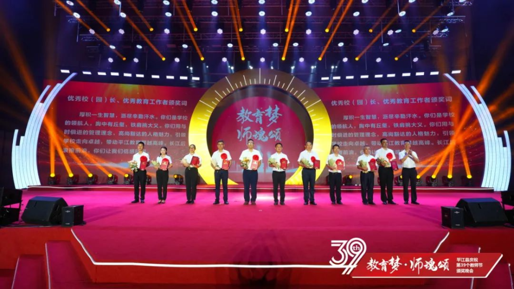 晚会上,平江一中和平江颐华学校获2023年高中教育教学突出贡献奖;会议表彰了20位“优秀校(园)长”、20位“平江县最美教师”、40位“师德标兵”、20位“优秀特(定)岗教师”186位“优秀教师”、80位“优秀班主任”、22位“优秀教育工作者”、6位“优秀支教教师”,以及26位2023年张立群奖教基金系列奖项获奖教师(校长)。