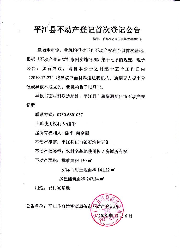 潘平 向金燕平江县不动产首次登记公告伍字第2019285号