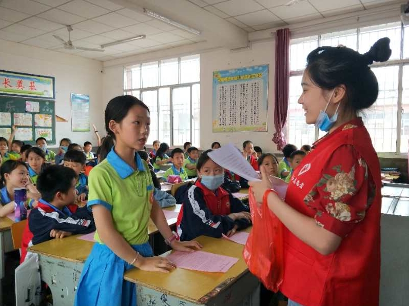 5月21日下午,新时代文明实践站百花台社区志愿者张佳奇、刘娉、易小玲、钟灵毓秀、李亚辉一行到三阳明德学校开展“创文进校园,文明伴成长”公益活动。旨在引导辖区内青少年遵守文行为,提高文明素养,提升创文知晓度和行动力,更好的发挥社区在未成年人思想道德建设中的作用。
