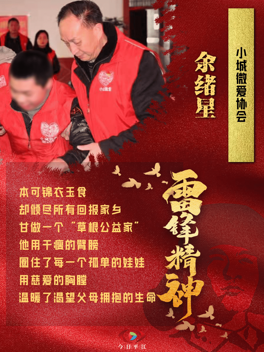 余绪星,现任小城微爱协会党支部书记,曾主动放弃生意经营和定居北京,扎根家乡致力公益事业8年,每年出资10余万元用于关爱困难家庭和留守儿童,引入儿童服务站、相约爱小丫等10余个重点项目,筹集爱心物资700余万元,惠及18个乡镇,60余所学校,留守儿童3万余名。