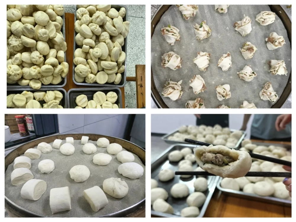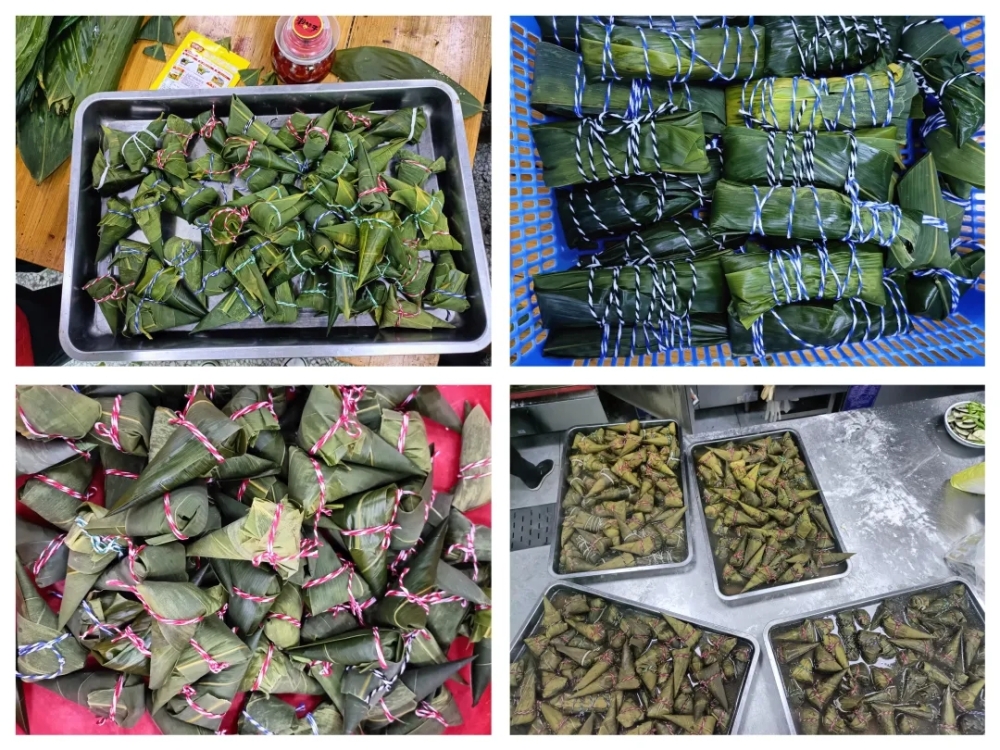 活动现场粽叶飘香,煮熟的包子香气飘飘。在老师傅的细心教学下,大家纷纷动起手来,先看包粽子这边,大家捋粽叶、做漏斗状、填糯米、压紧实、封口、扎捆,巧手翻飞,一片片清香的粽叶、一粒粒晶莹的糯米,在一双双巧手下,一个个可爱、鲜绿的粽子就这么诞生了。再看包包子那边,和面、揉面、发面、剁馅、擀面······大家分工明确,包出一个个大白包子。活动现场秩序井然、其乐融融。