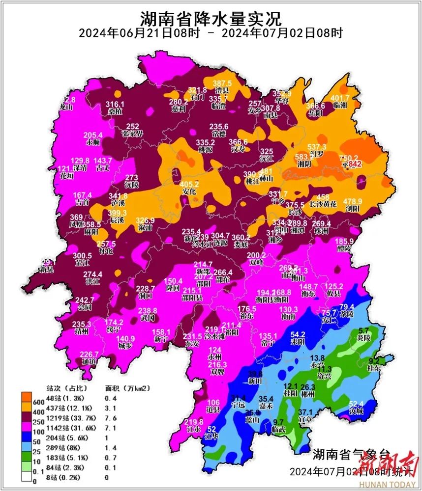 6月21日8时至7月2日8时,全省降雨量实况图。省气象台供图晴热高温天气为何来得这么快?“主要原因是副热带高压加强,天气转晴。”湖南省气象台国家级首席预报员刘红武说。
